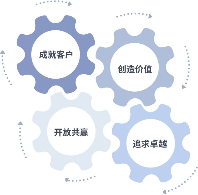 成就客户是一切决策的出发点,,,创造价值是衡量所有工作的标准,,追求卓越是我们做事做人的态度,,,开放共赢是我们的格局也是最终的结果。。价值观的齿轮环环相扣,,,,推动着组织里的每个人不断向前。。