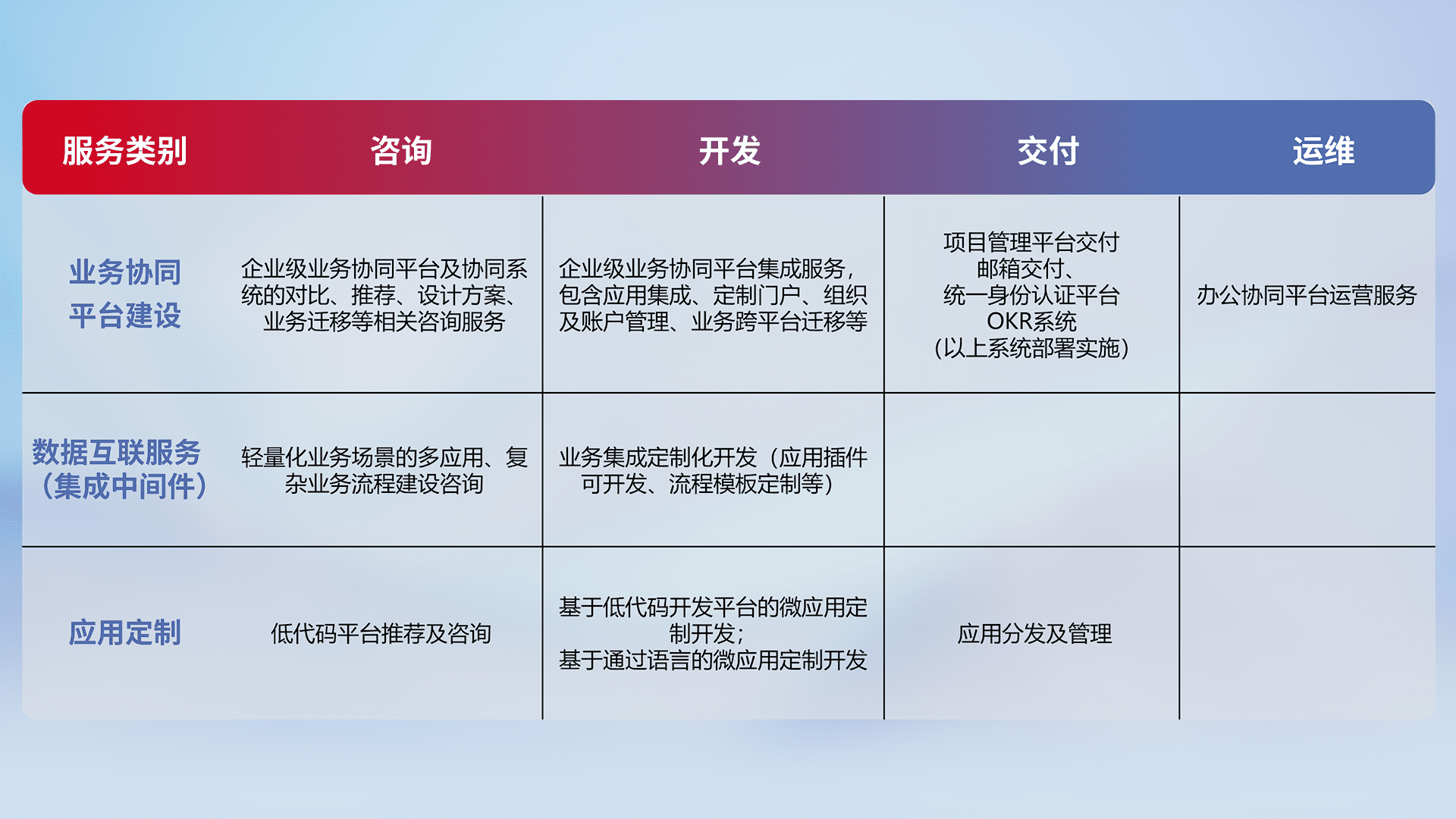 针对钉钉、、、企微、、、、IDaas等平台级产品提供产品的规划、、方案、、交付、、、、定制化开发等服务,,,,实现如统一协同办公、、、、智能客户服务、、、混合会议管理、、、、智能数据查询、、、、等业务场景,,,,实现数字化转型。。。。